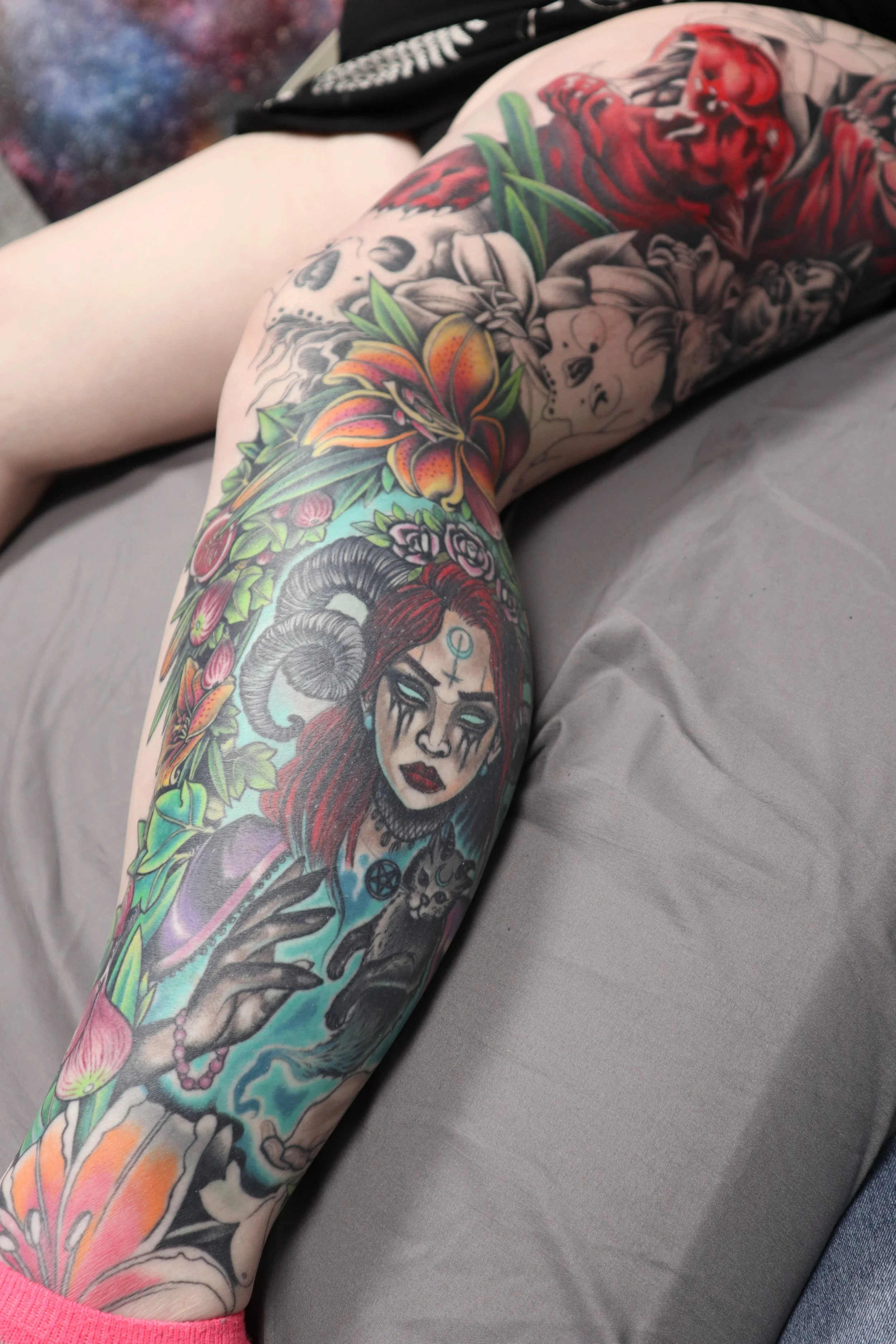Breathing new life into an older tattoo where the client resonates with the story of a goddess Lilith. The depiction spans the entire leg and is more intricate beyond this level of completion.