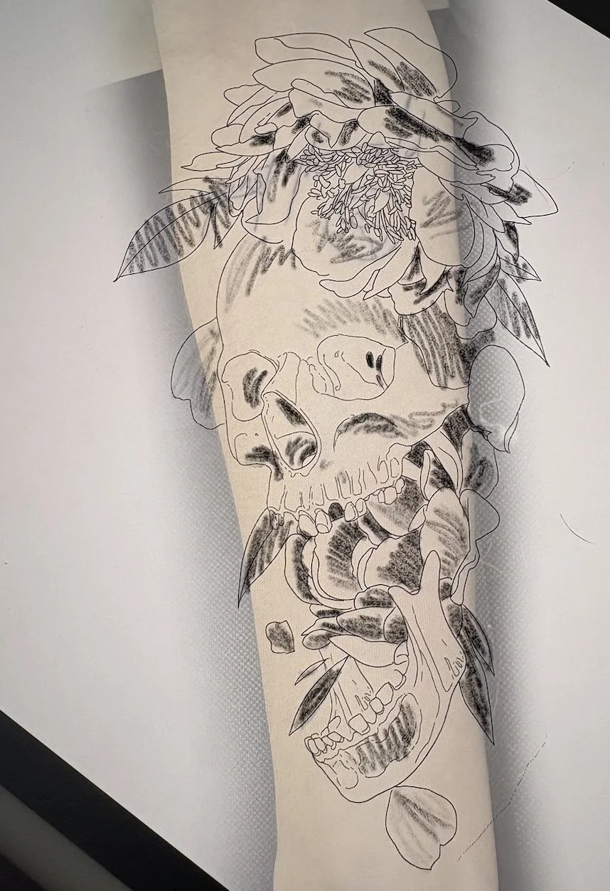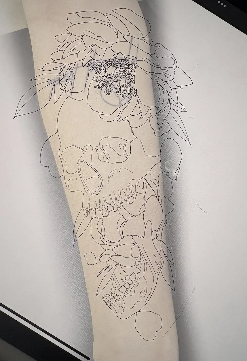 Here, you can see how digital planning plays a key role in the process. Using Procreate, I mapped out exactly where the skull and peonies would sit to achieve the most natural flow on the client’s arm.