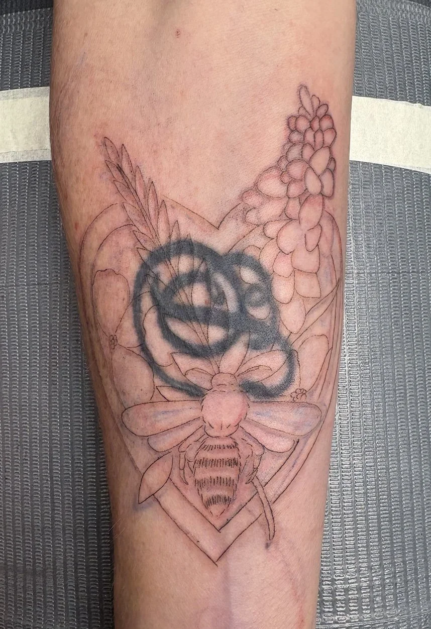 Because the original tattoo had very tight margins, it was more effective to draw the new design directly on the client’s arm rather than on a stencil. This allowed the artwork to evolve organically, following her natural contours and creative direction in real time.