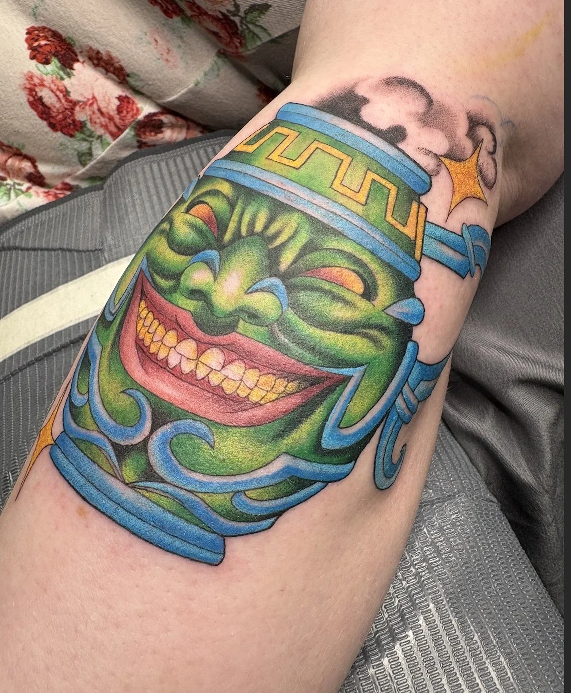 Fantasy Arm Tattoo | Pot of Greed & Yughi-oh-Style Character by Girly Tattoos