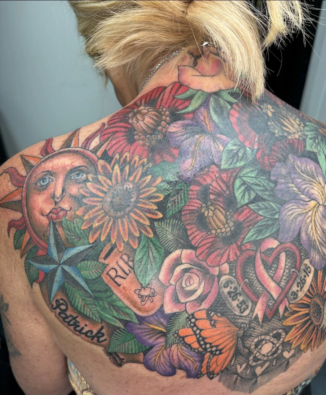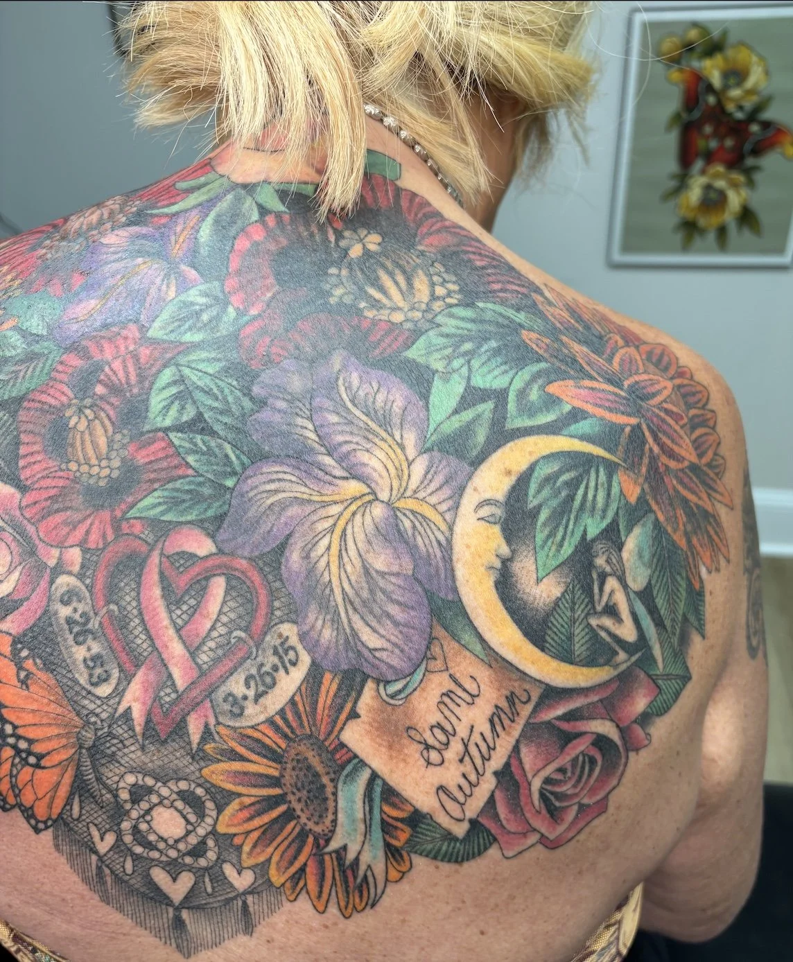 back tattoo cover up, floral tattoo, memorial tattoo, tattoo artist Charlotte NC, tattoo transformation, Girly Tattoos, color realism tattoo
